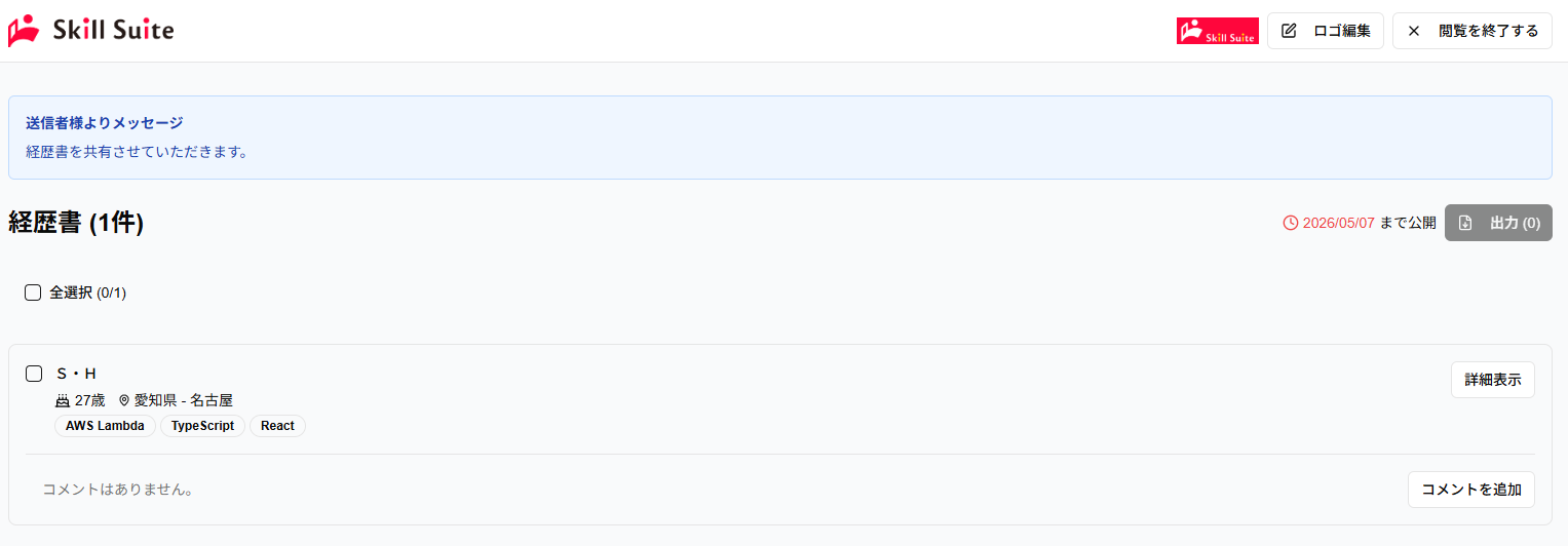 認証が完了すると経歴書の一覧が表示されます。URL 発行者からのメッセージがある場合は一覧上部に表示されます。また、URL の有効期限と残り公開日数も確認できます。