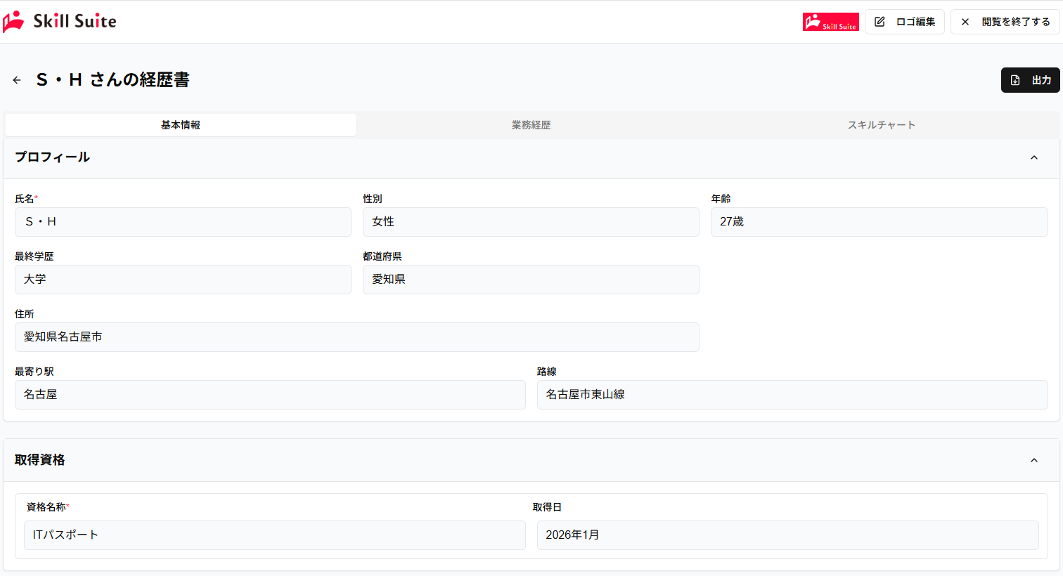 - スキルチャート:スキルの習熟度(URL 作成時にスキルチャートの出力が有効な場合のみ表示)
