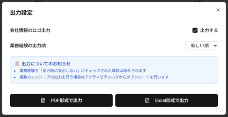 一覧で経歴書を選択し「出力」ボタンをクリックすると、PDF または Excel 形式でダウンロードできます。経歴書詳細画面からも出力できます。