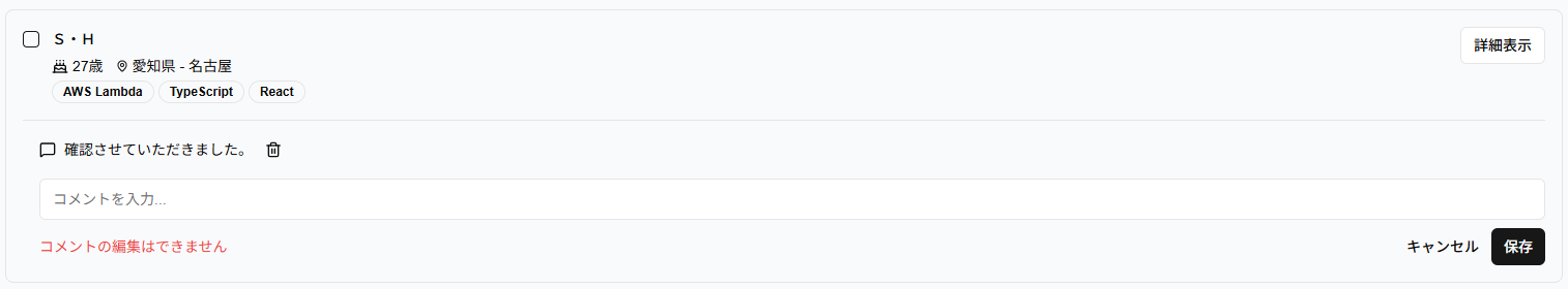 各経歴書にコメントを追加できます。コメントは閲覧画面上でのみ表示され、経歴書の内容には影響しません。追加したコメントは削除することも可能です。