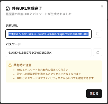 URL出力を使うと、Skill Suite のアカウントを持たない相手にもパスワード付きURLで経歴書を共有できます。